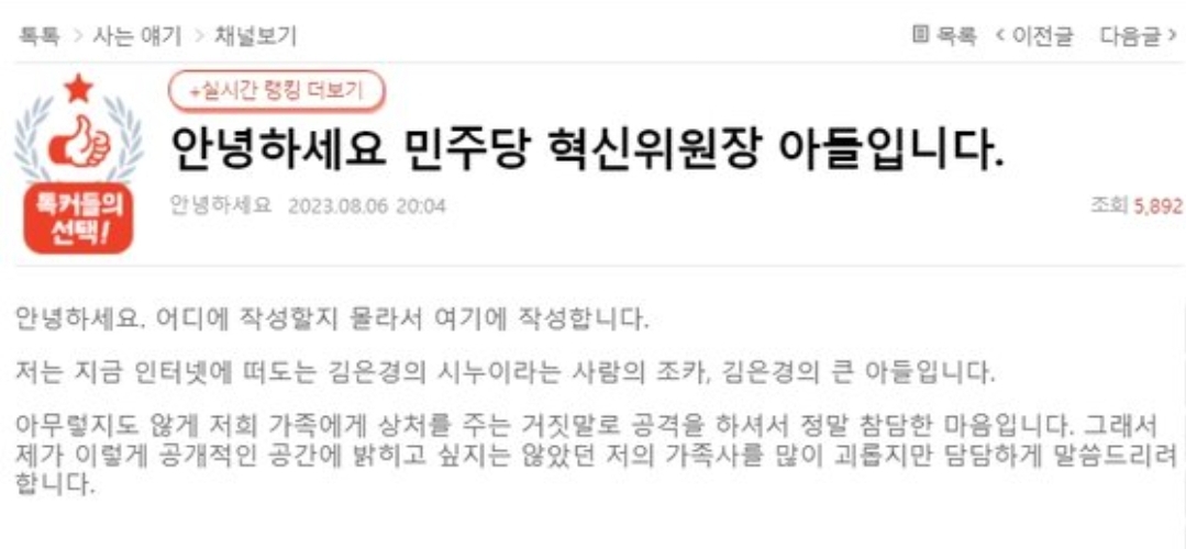 김은경 혁신위원장 큰아들 반박 내용