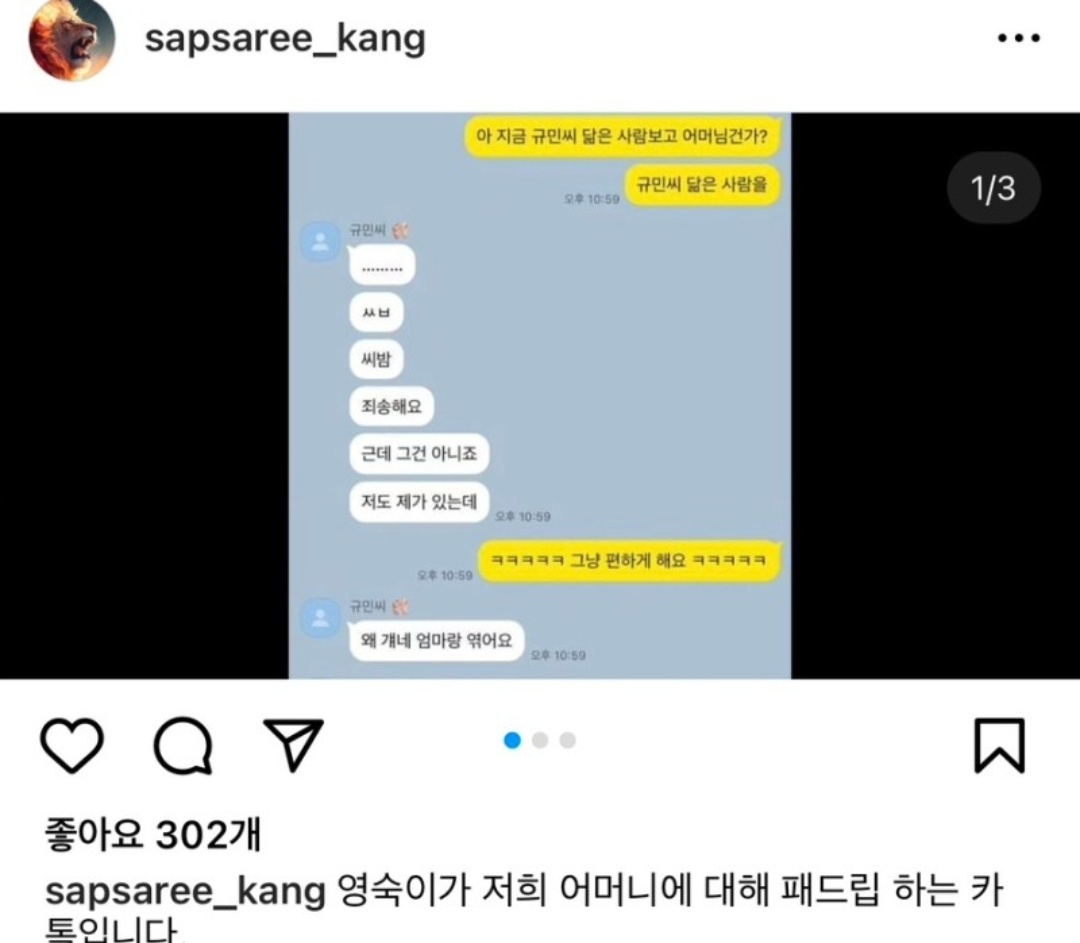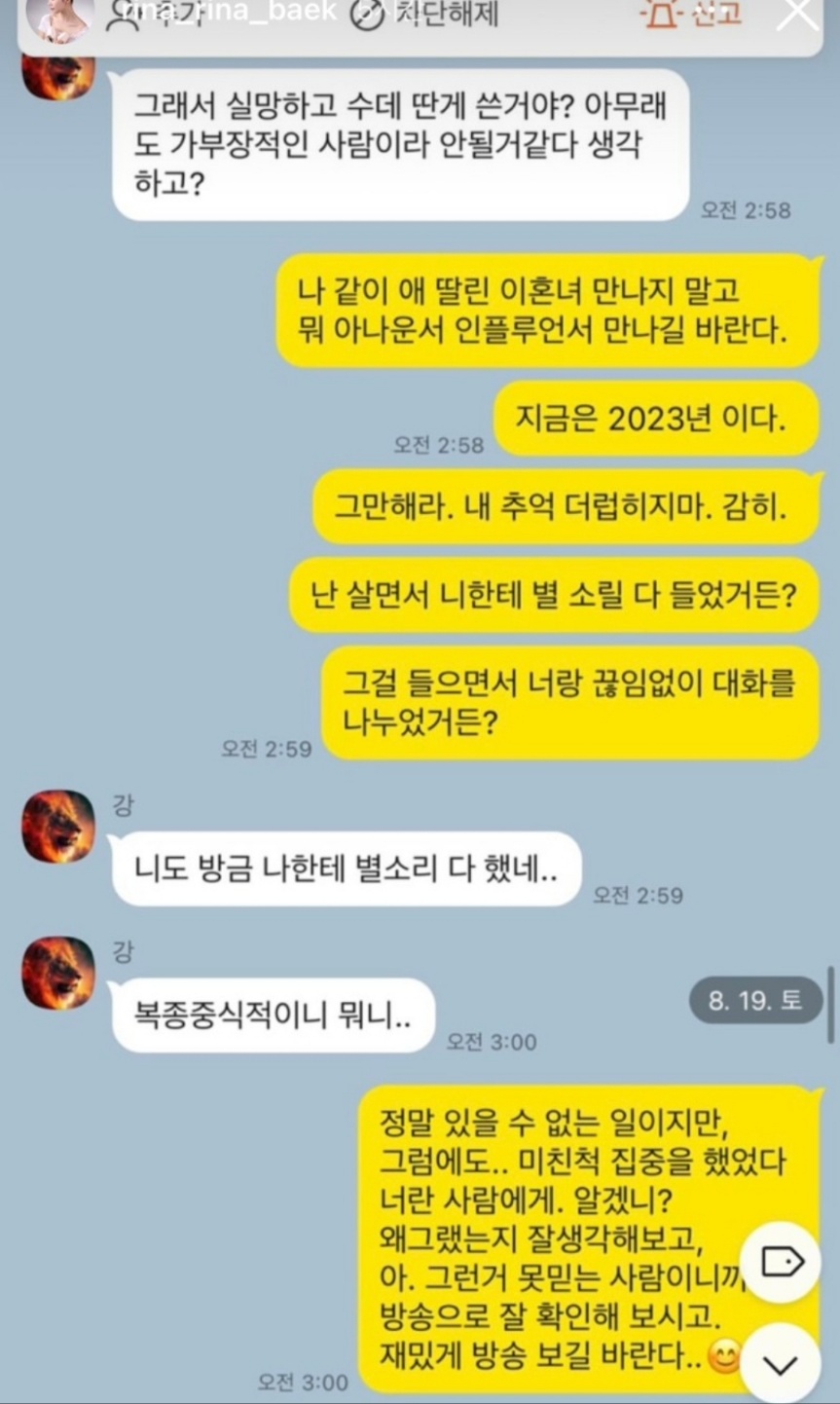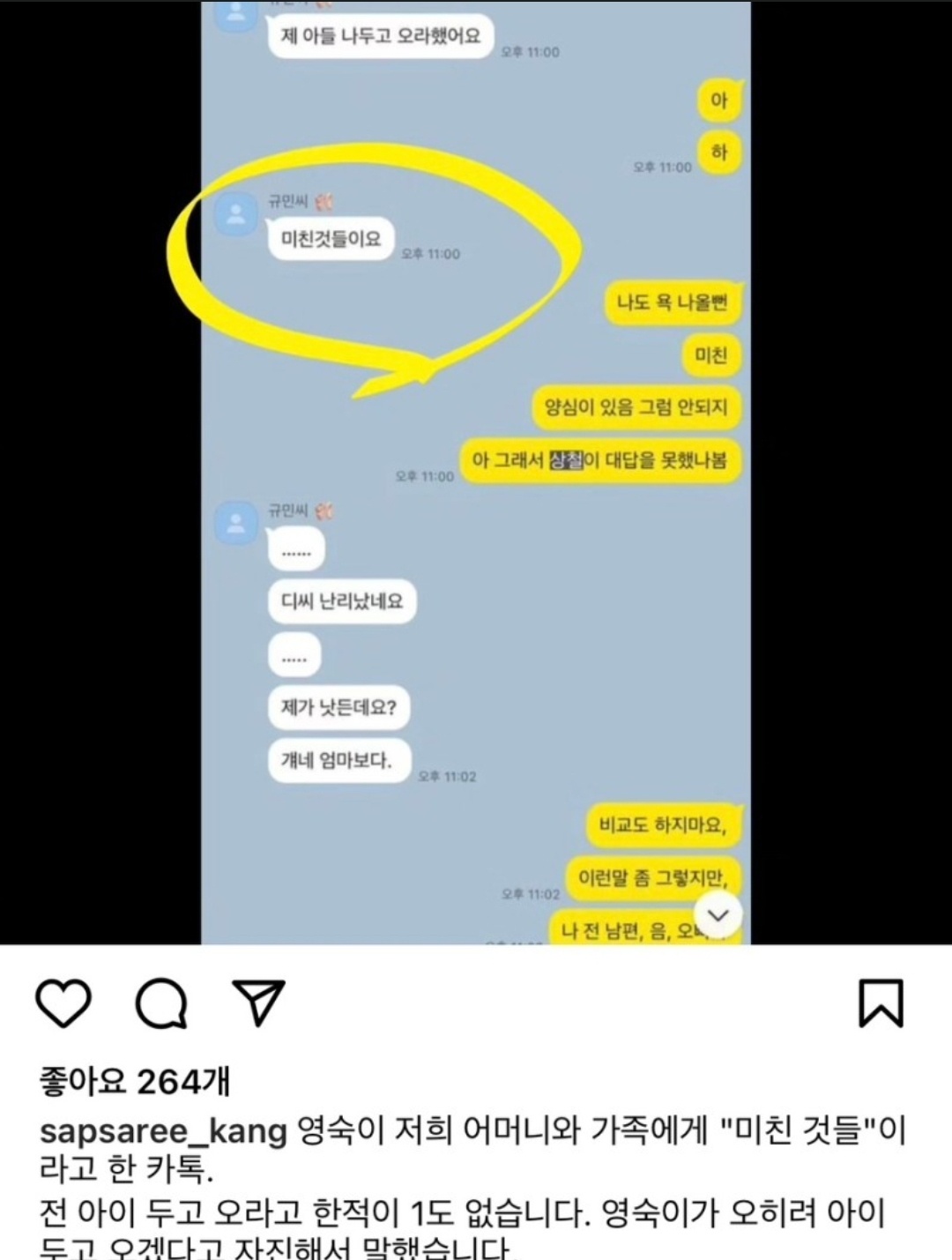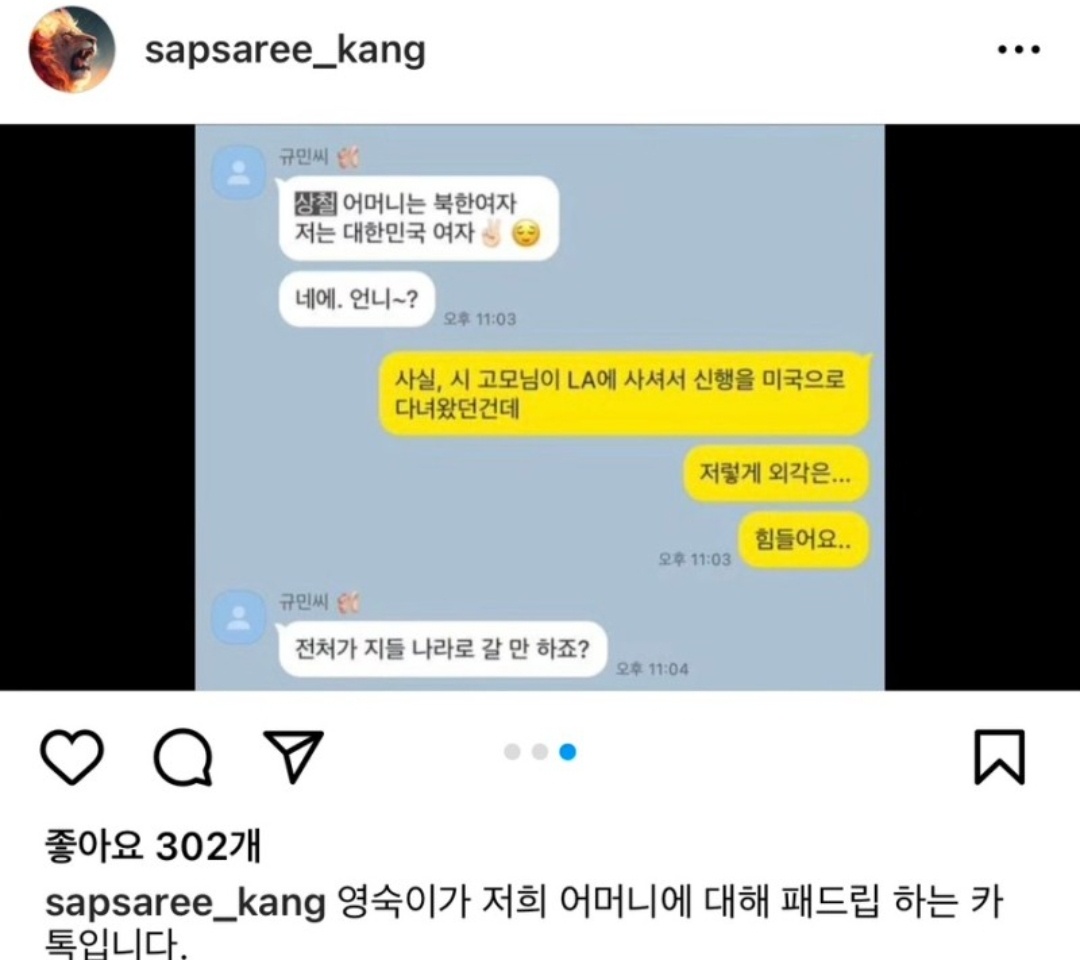 상철은 상철 어머니가 북한 여자라는 카톡과 전처가 지들 나라로 갈만하지 않냐는 카톡 내용을 증거로 올렸습니다. 심지어 미친것들이라는 말로 패드립을 했다는 것을 인스타에 올렸습니다. 이런 제보를 받았다면 화가 많이 났을 것 같네요.