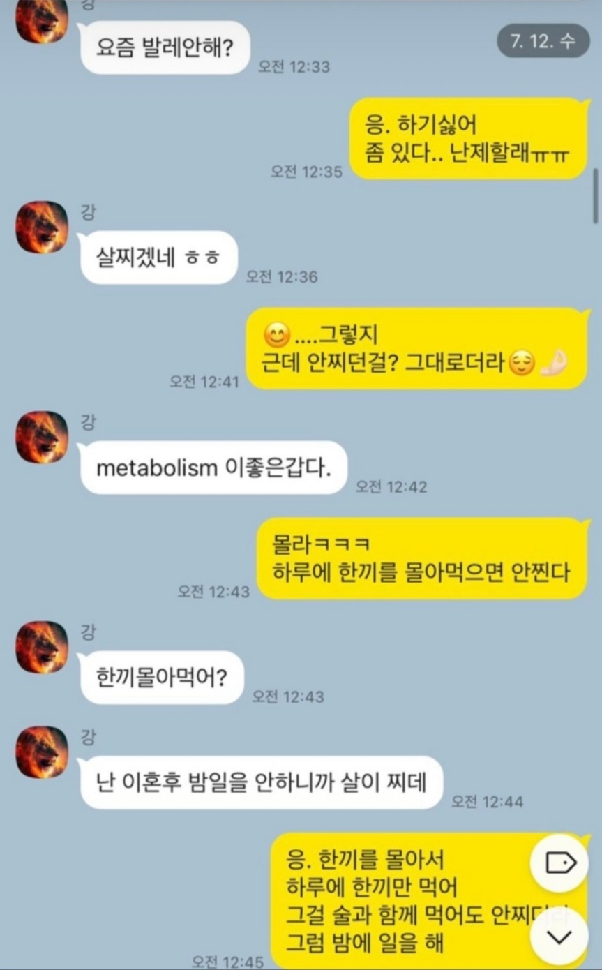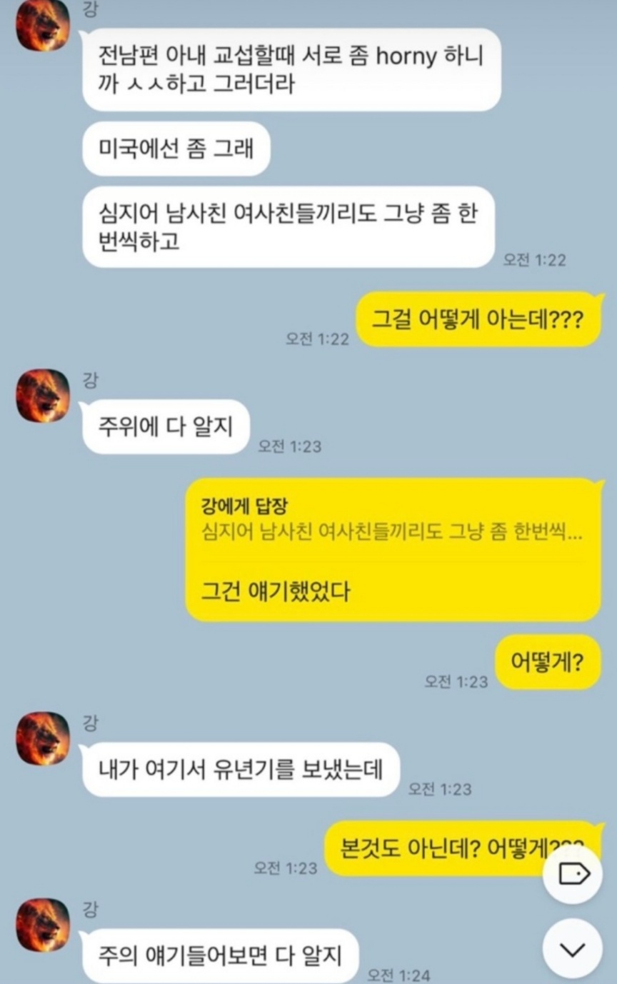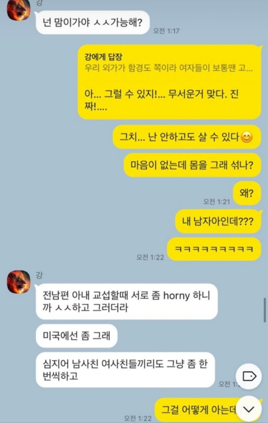 19금 내용이 난무하는 카톡 내용을 공개한 영숙입니다. 1일 1식으로 살이 찌지 않는다는 영숙에게 이혼 후 밤일을 하지 않아 살이 찐다는 말을 하는 상철입니다. 미국은 fwb 문화가 심하다 말, 남사친 여사친 간의 관계를 말 등 카톡이 공개되어 이미지에 타격을 입게 될 것 같습니다.