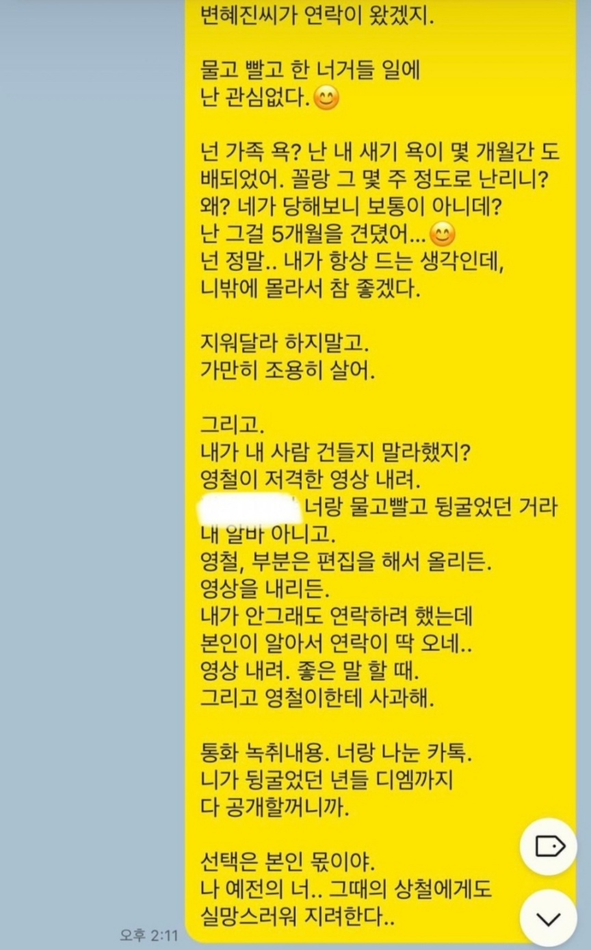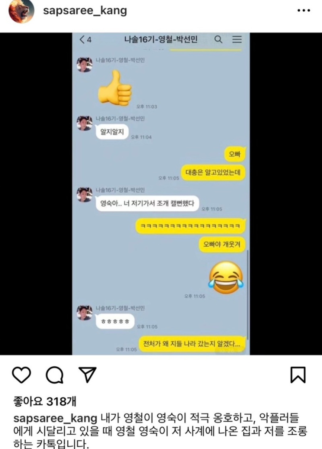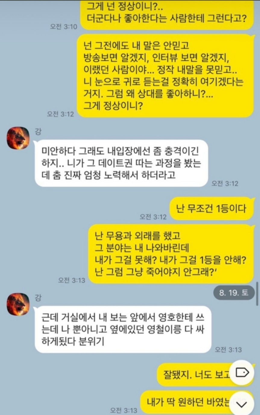 변혜진과 연인관계였던 상철보다 영철과 더 친하다는 dm으로 상철의 마음을 어지럽힌 모습이네요. 나솔사계에 출연한 상철의 집을 보고 영철과 영숙이 조롱하는 듯한 카톡을 나눈 내용도 폭로ㅎ한 상철입니다.