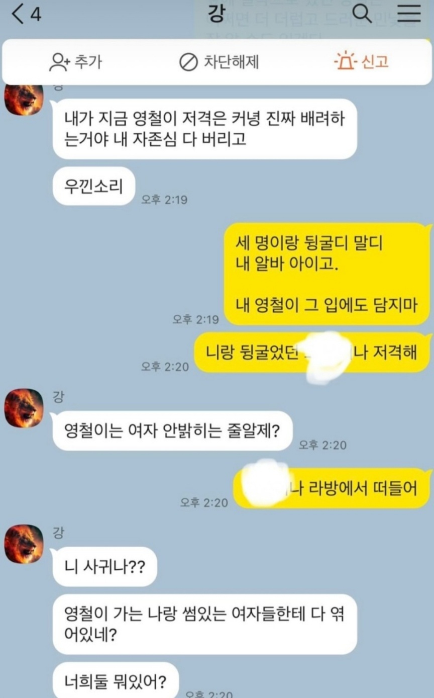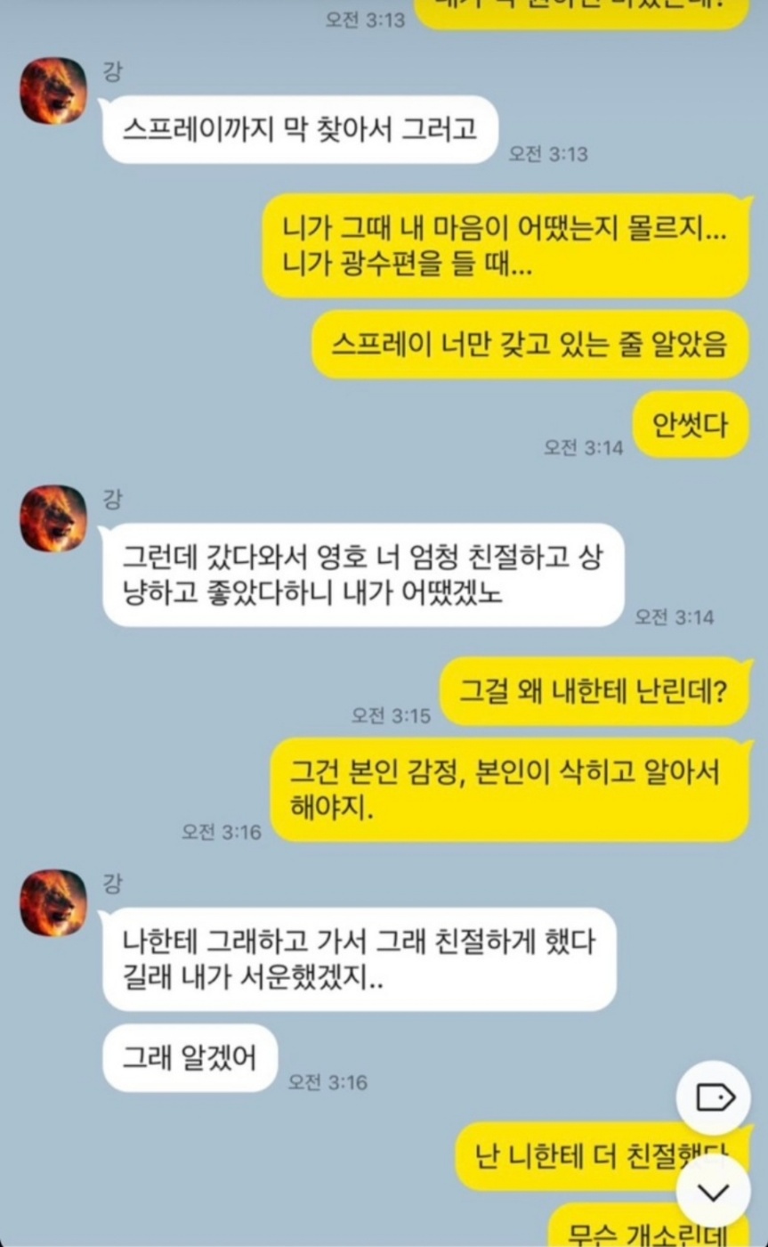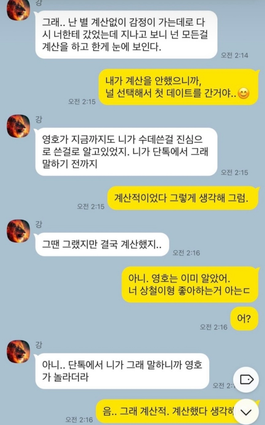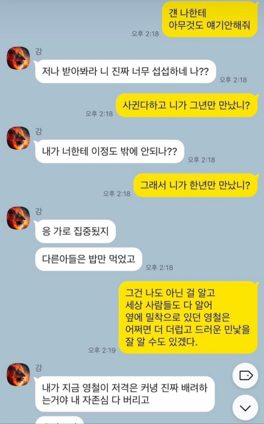 변혜진과 연인관계였던 상철보다 영철과 더 친하다는 dm으로 상철의 마음을 어지럽힌 모습이네요. 나솔사계에 출연한 상철의 집을 보고 영철과 영숙이 조롱하는 듯한 카톡을 나눈 내용도 폭로ㅎ한 상철입니다.