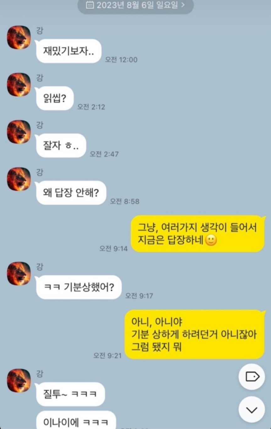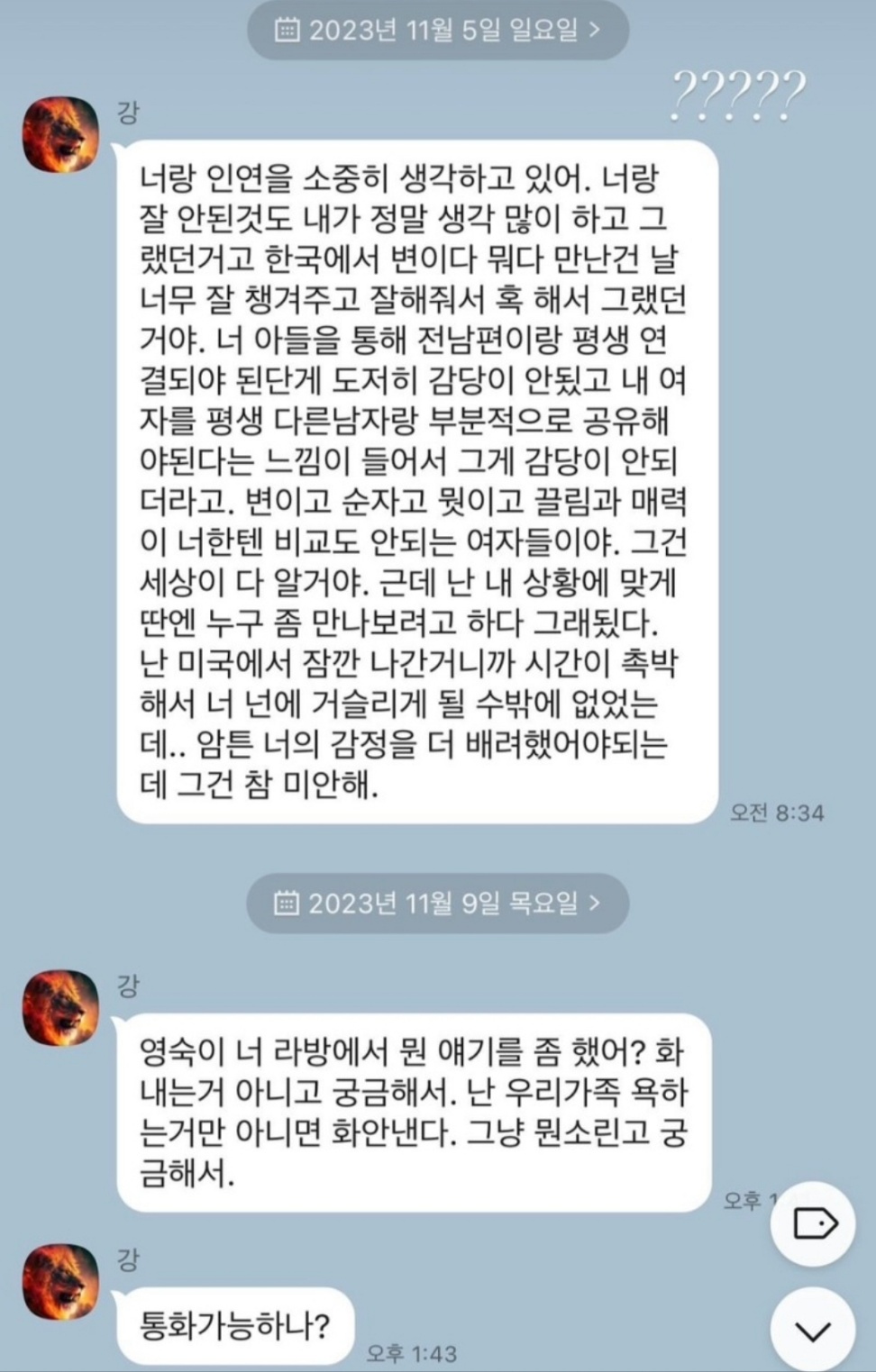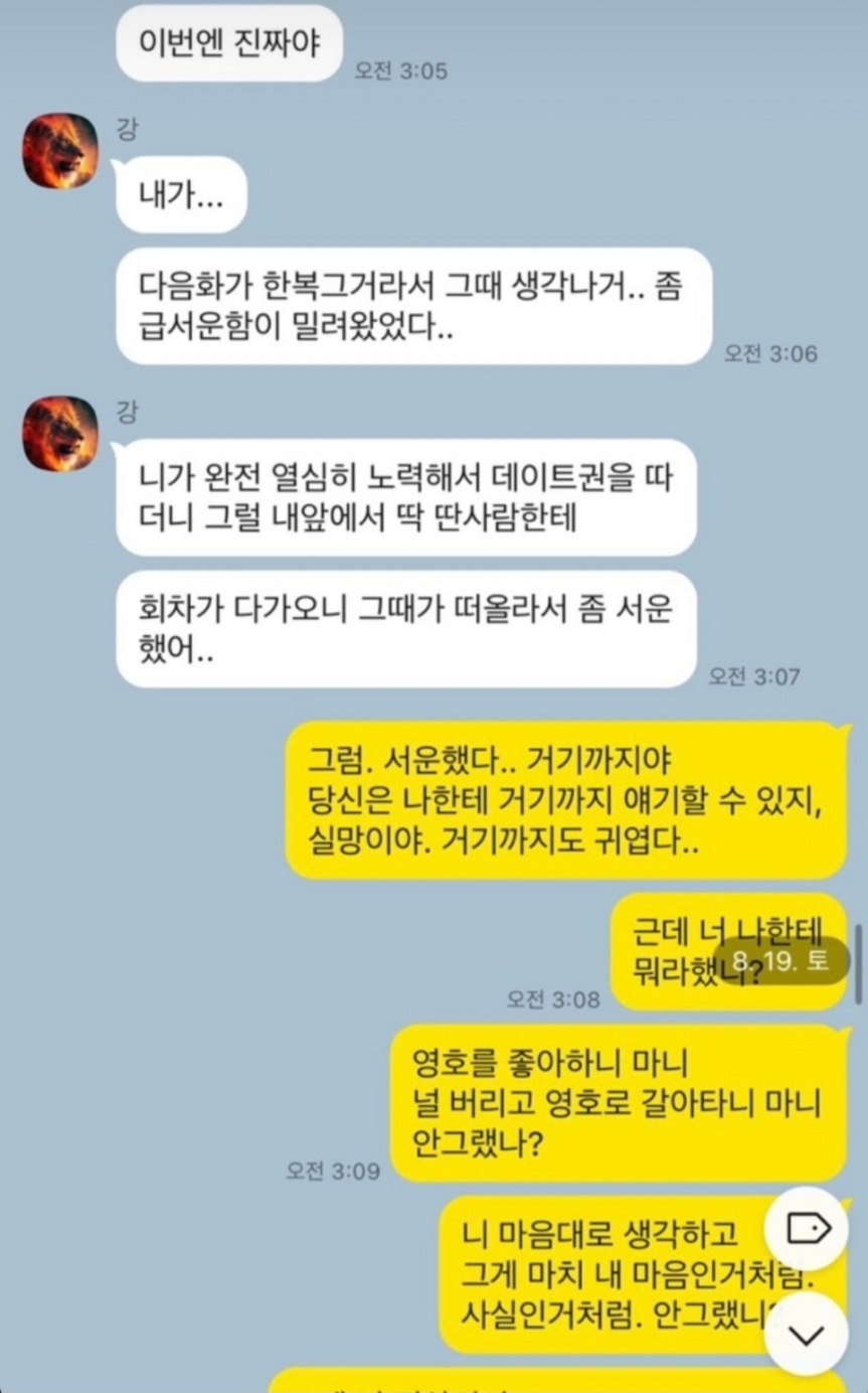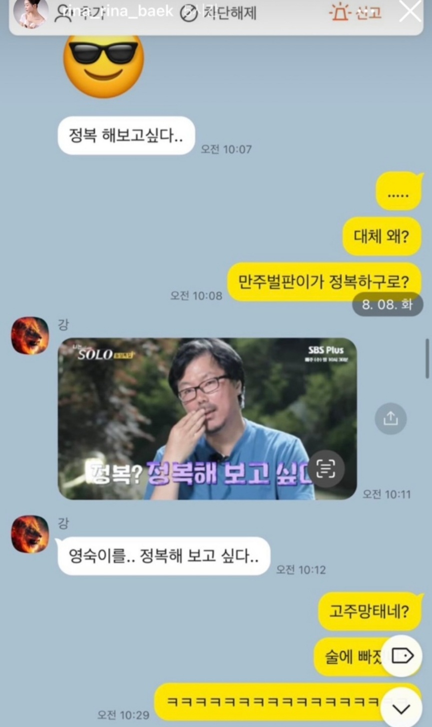 영숙에서 성희롱 수준의 메시지를 보낸 상철입니다. 팬아트를 보내면서 정복하고 싶다는 둥 뽀뽀를 해달라는 둥 영숙에게 계속해서 관심을 표현했는데요. 둘은 나는 솔로 방송 모습에 대해서도 이야기를 나누는 모습입니다. 슈퍼데이트권 사용했을 때 서운했던 감정들도 서로 털어놓았습니다. 방송 당시의 집착했던 모습이 카톡에서도 다시 보이네요.