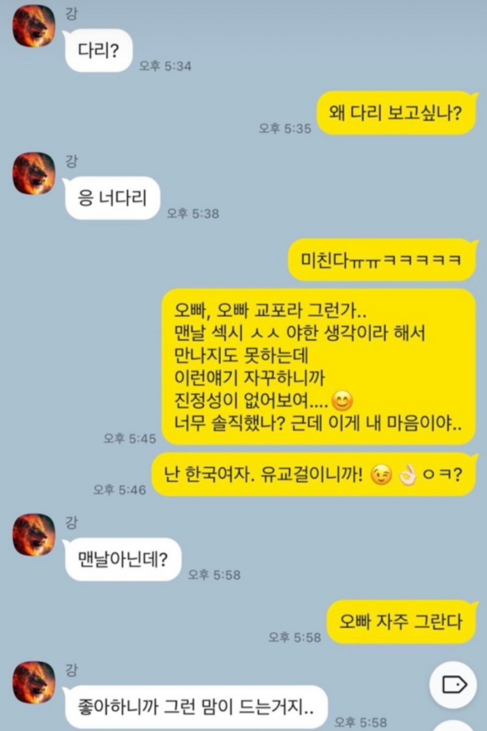 영숙에게 더 많은 사진을 요구하면서 19금 멘트를 날리는 상철입니다. 다리 사진을 보내달라는 등 성희롱 수준의 대화를 이어갑니다. 이에 영숙은 병이라고 농담을 하며 진정성 없는 모습 같아 보인다며 선을 긋는 모습입니다.