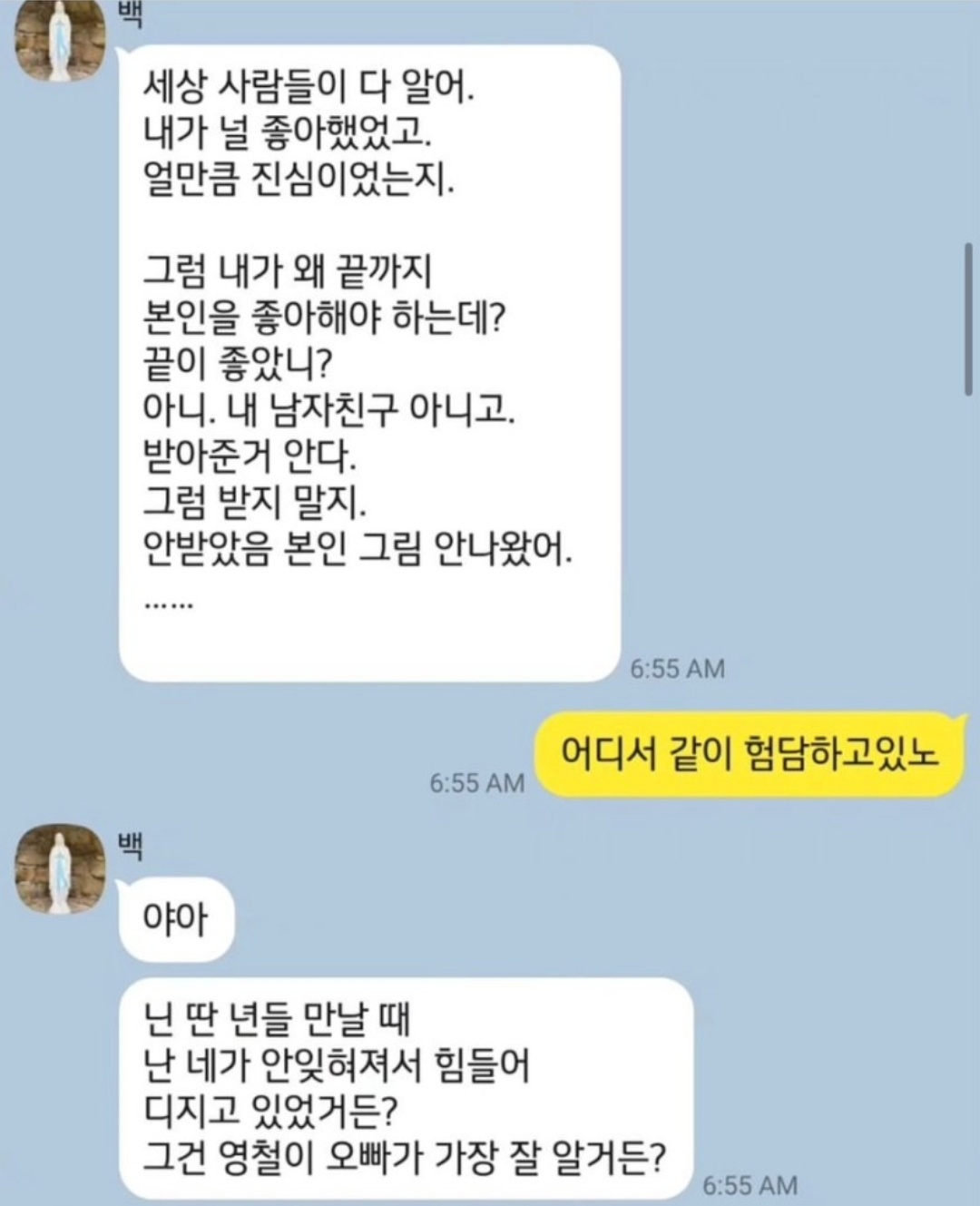 가족을 욕했다는 생각에 영숙에게 아마 한바탕 욕설을 퍼부은 것으로 추정됩니다. 더군다나 변혜진의 상철 양다리 폭로로 상철의 이미지도 많이 추락한 상태였는데요. 본인과 사귀는 사람이 영철과 썸을 탄다는 말은 아마 변혜진을 말하는 것 같습니다. 한국에서 3명의 여자를 만났다고 고백하는 상철에게 여러 명을 동시에 만난 상철을 비난하는 영숙입니다. 상철은 본인을 음해하려는 악플러들의 공격이라고 하지만 영숙은 비난을 이어갑니다. 여기까지 무로 55장의 카톡 내용을 스토리에 올린 영숙입니다.