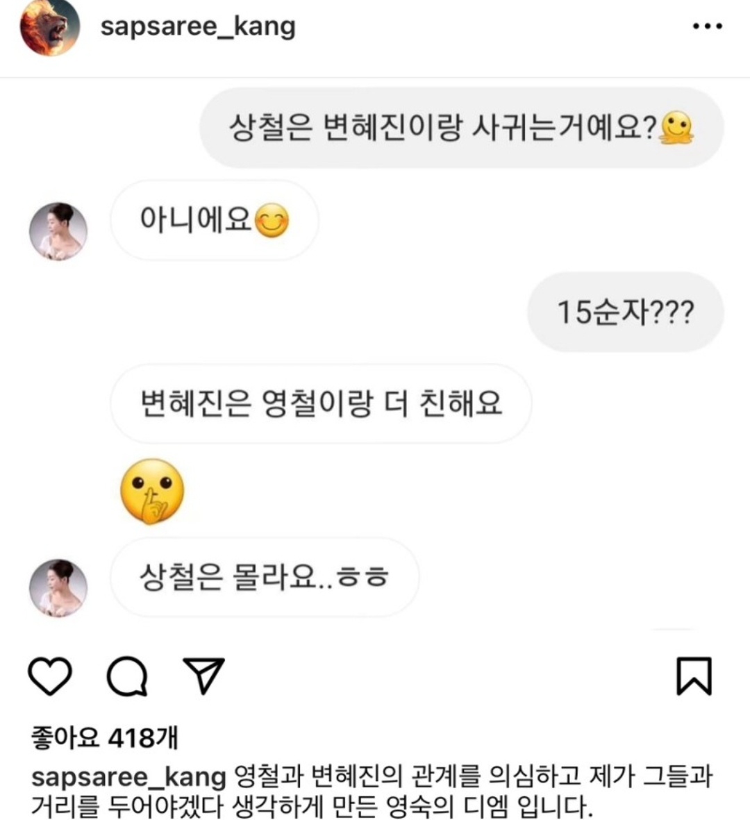 변혜진과 연인관계였던 상철보다 영철과 더 친하다는 dm으로 상철의 마음을 어지럽힌 모습이네요. 나솔사계에 출연한 상철의 집을 보고 영철과 영숙이 조롱하는 듯한 카톡을 나눈 내용도 폭로ㅎ한 상철입니다.