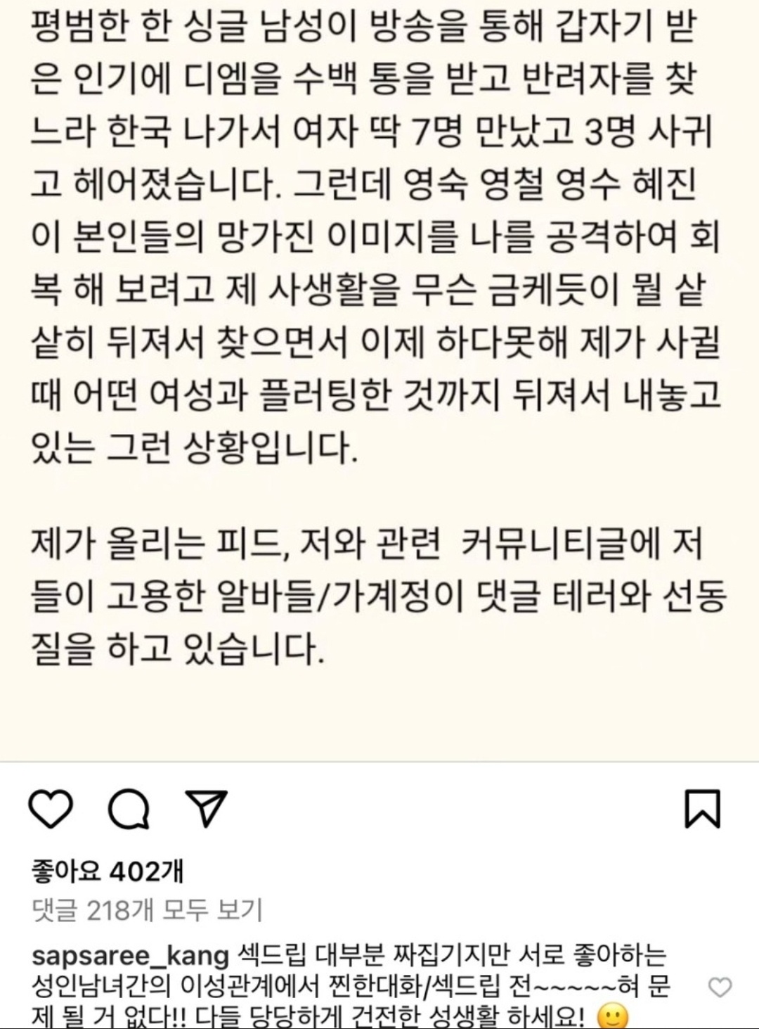 영숙의 인스타를 본 상철이 바로 인스타 피드를 올려 반박합니다. 평범한 싱글 남성이 수백통의 디엠을 받고 그중 3명을 사귀게 되었다며 영숙, 영철, 영수, 혜진이 본인들의 망가진 이미지를 자신을 공격하여 회복하려고 한다는 글을 올렸습니다. 19금 대화도 짜깁기지만 전혀 문제 될 것이 없는 이성 간의 대화였다고 주장합니다.