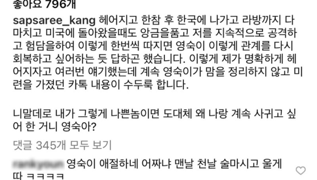 짜깁기라는 말에 화가 난 영숙은 카톡 내용을 스크롤로 내리며 영상을 올렸습니다. 그동안 헤어지자는 말에도 영숙이 미련을 가졌던 글들이 많다며 방송이 끝난 이후에도 계속 폭로가 이어지고 있습니다.