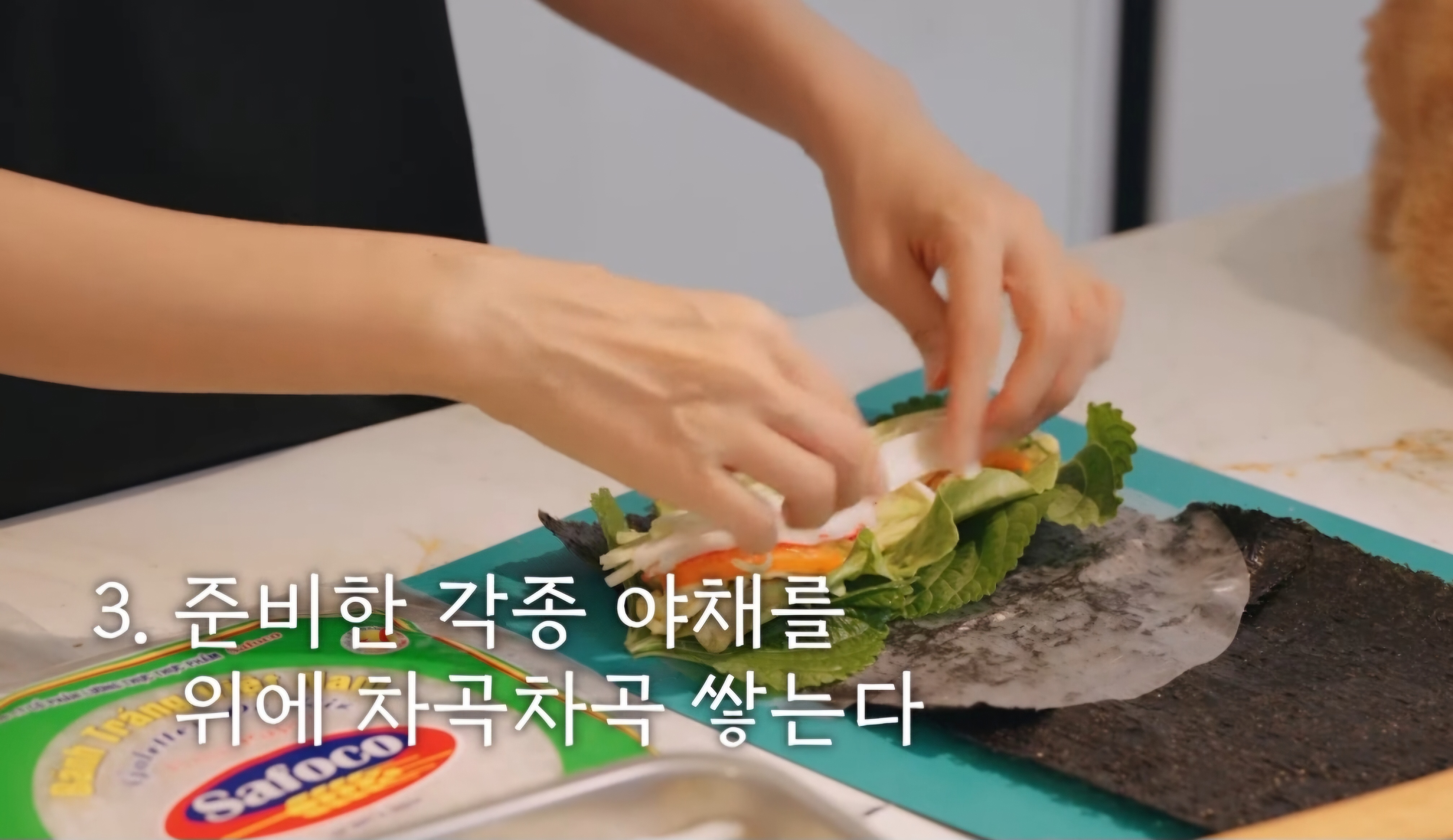 3. 라이스페이퍼 위에 깻잎을 올려주고, 다른 쌈채소들도 차곡차곡 쌓아줍니다.