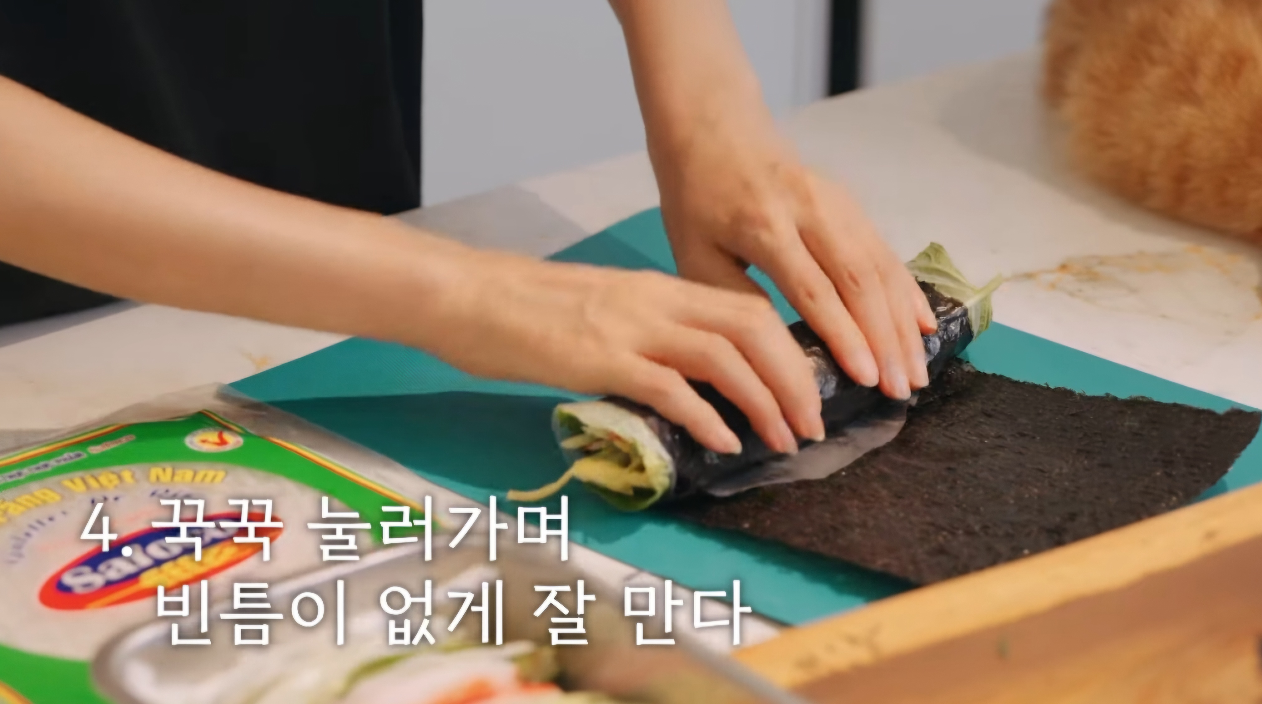 5. 김을 꾹꾹 눌러가면서 빈틈 없이 잘 말아주세요.
