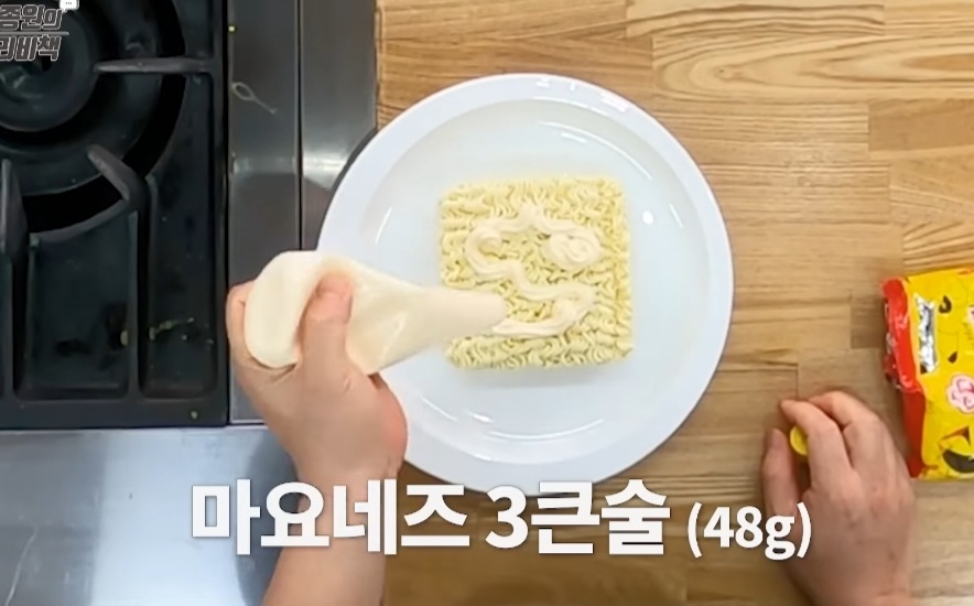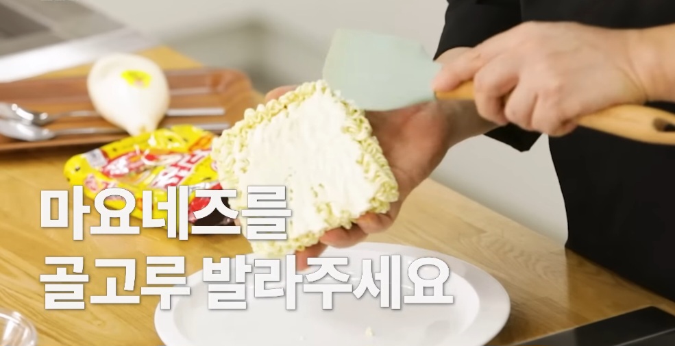 2. 라면 위에 마요네즈를 짜준 뒤 숟가락이나 주걱으로 골고루 펴 발라주세요.