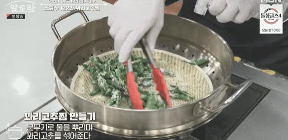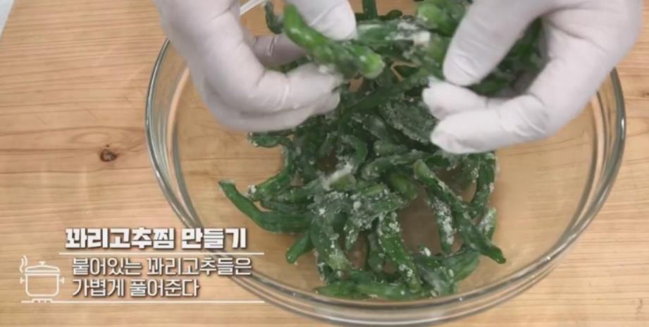 9. 꽈리고추를 섞어준 후 뚜껑을 닫고 2분간 더 쪄줍니다.