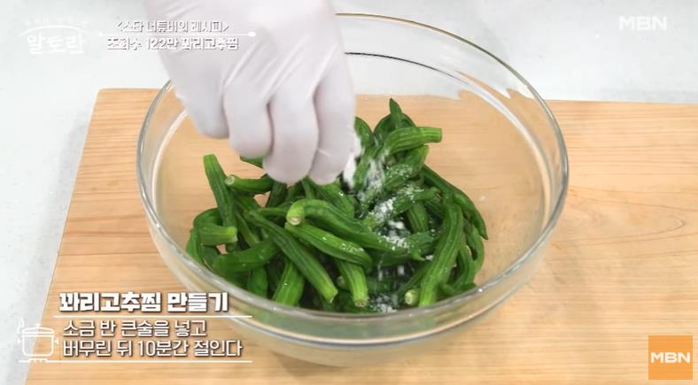 3. 물을 뿌린 꽈리고추에 소금 1/2 큰술을 넣고 버무려 준 후 10분간 절여주세요. 유튜브에서는 꽃소금을 사용하셨습니다.