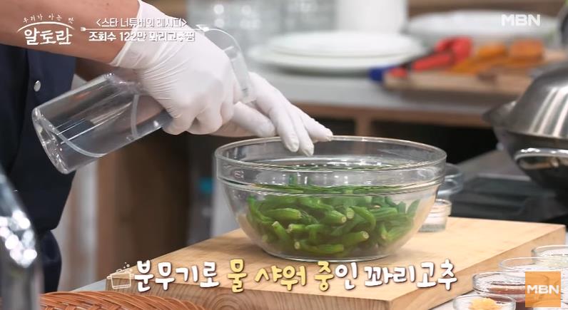 2. 꽈리고추를 소금에 절이기 전에 분무기에 물을 넣고 꽈리고추에 물을 뿌려줍니다.