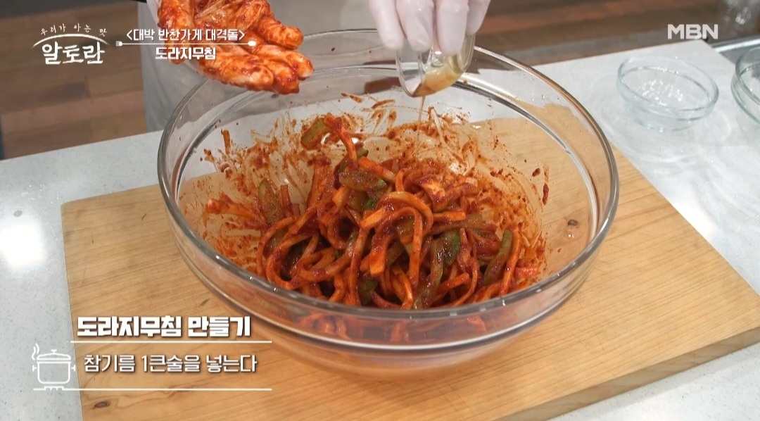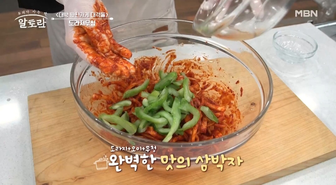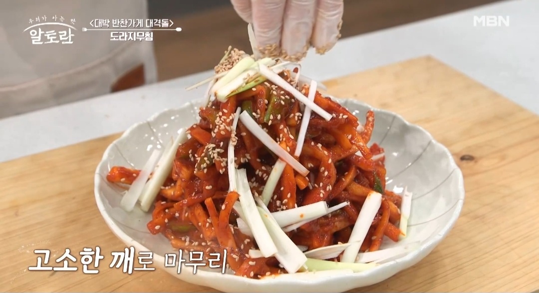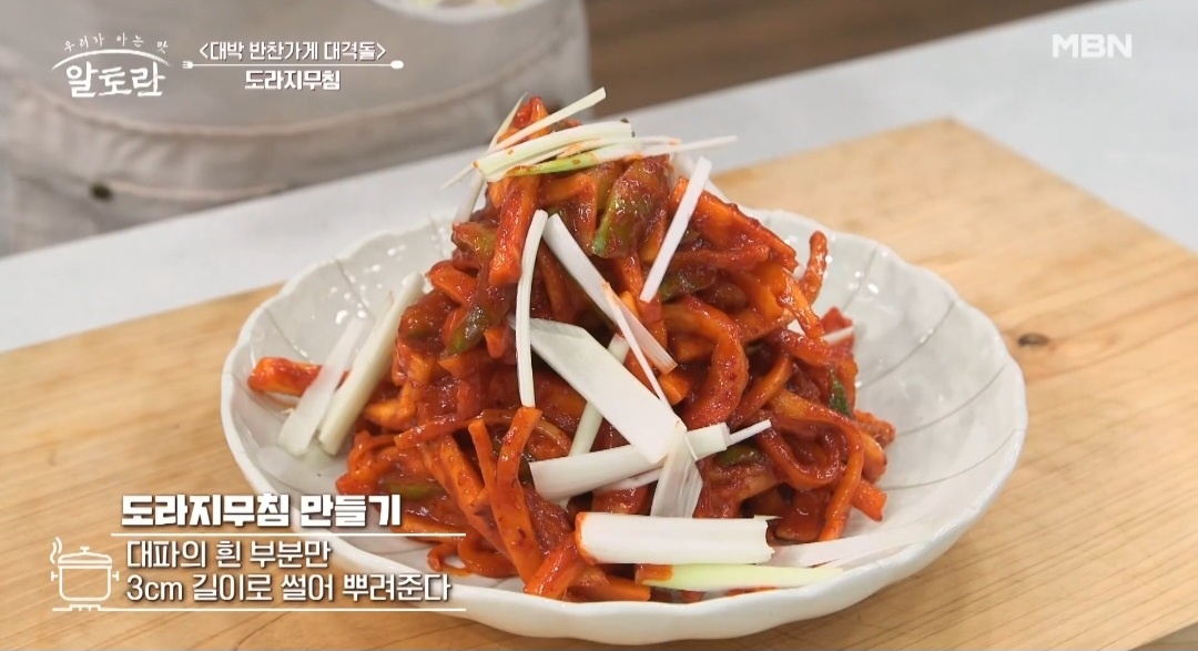 반찬가게 대표 메뉴로 제일 잘 팔리는 반찬으로 도라지무침을 알토란에서 만들어봤습니다. 한지원 대표가 도라지무침이 1위라고 해서 조금 의아했는데, 만드는 법을 배워보니 왜 판매 1등인지 알 수 있을 것 같았습니다. 쓴맛을 제거하기 위해 공을 들이고, 오이를 넣어 아삭한 맛까지 넣어주었습니다. 달걀장에서 만든 무청도 넣어주어서 보기만 해도 군침 도는 맛있는 도라지 무침이 완성되었습니다. 지금부터 알토란 도라지무침 만드는 법을 알아보겠습니다.