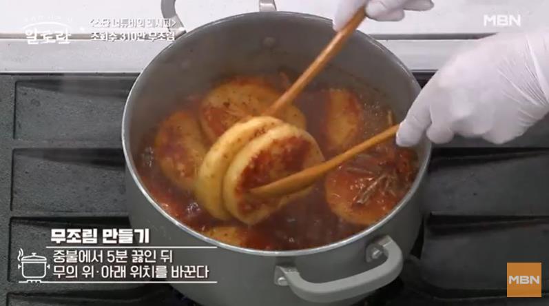 다른 무조림과 비교했을 때 무를 국간장과 물엿으로 절여주어 간을 맞춘 것, 건표고버섯 우린 물과 멸치를 사용하여 감칠맛을 극대화해 준 것이 알토란 무조림 만드는 법의 포인트입니다.