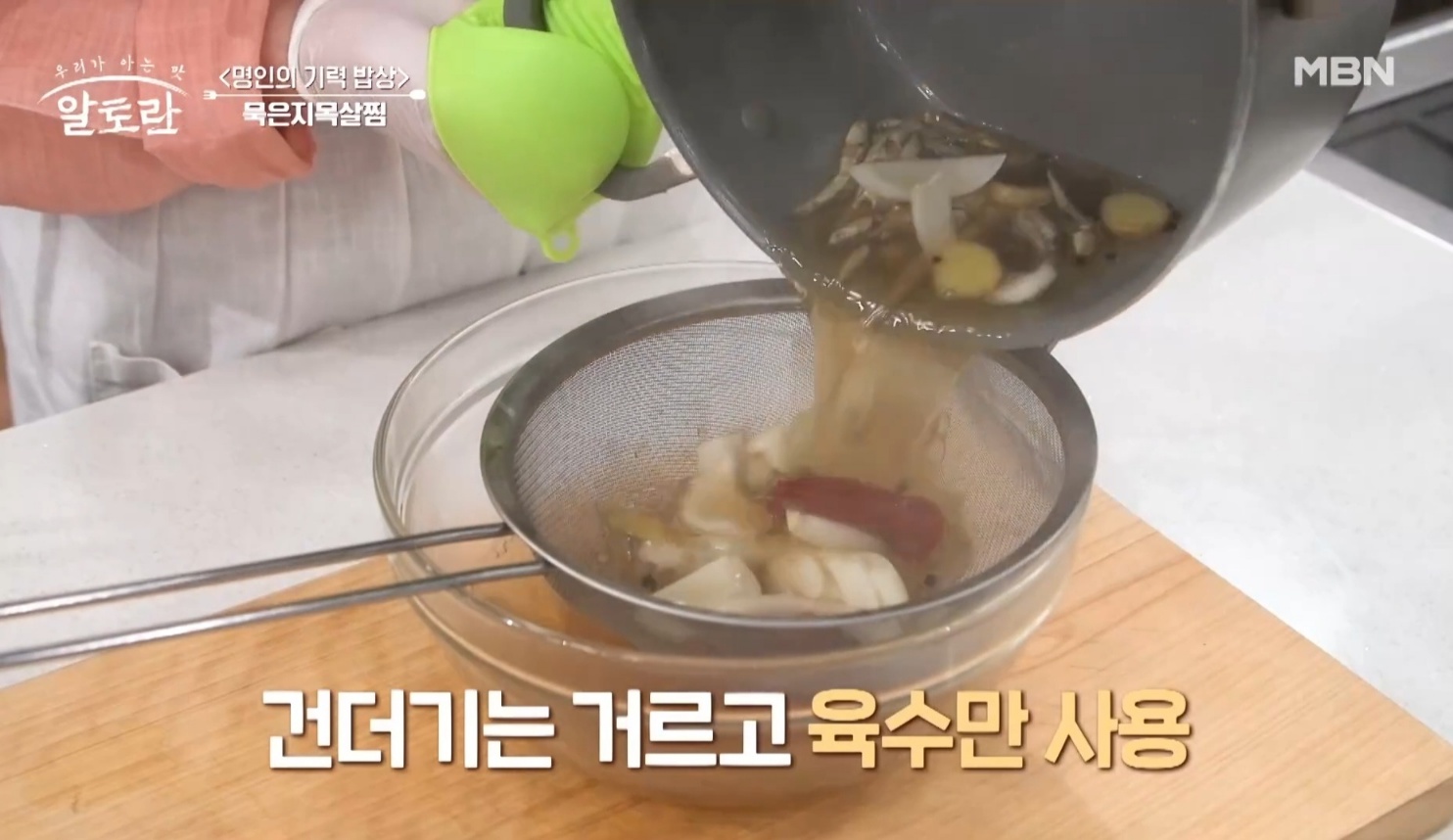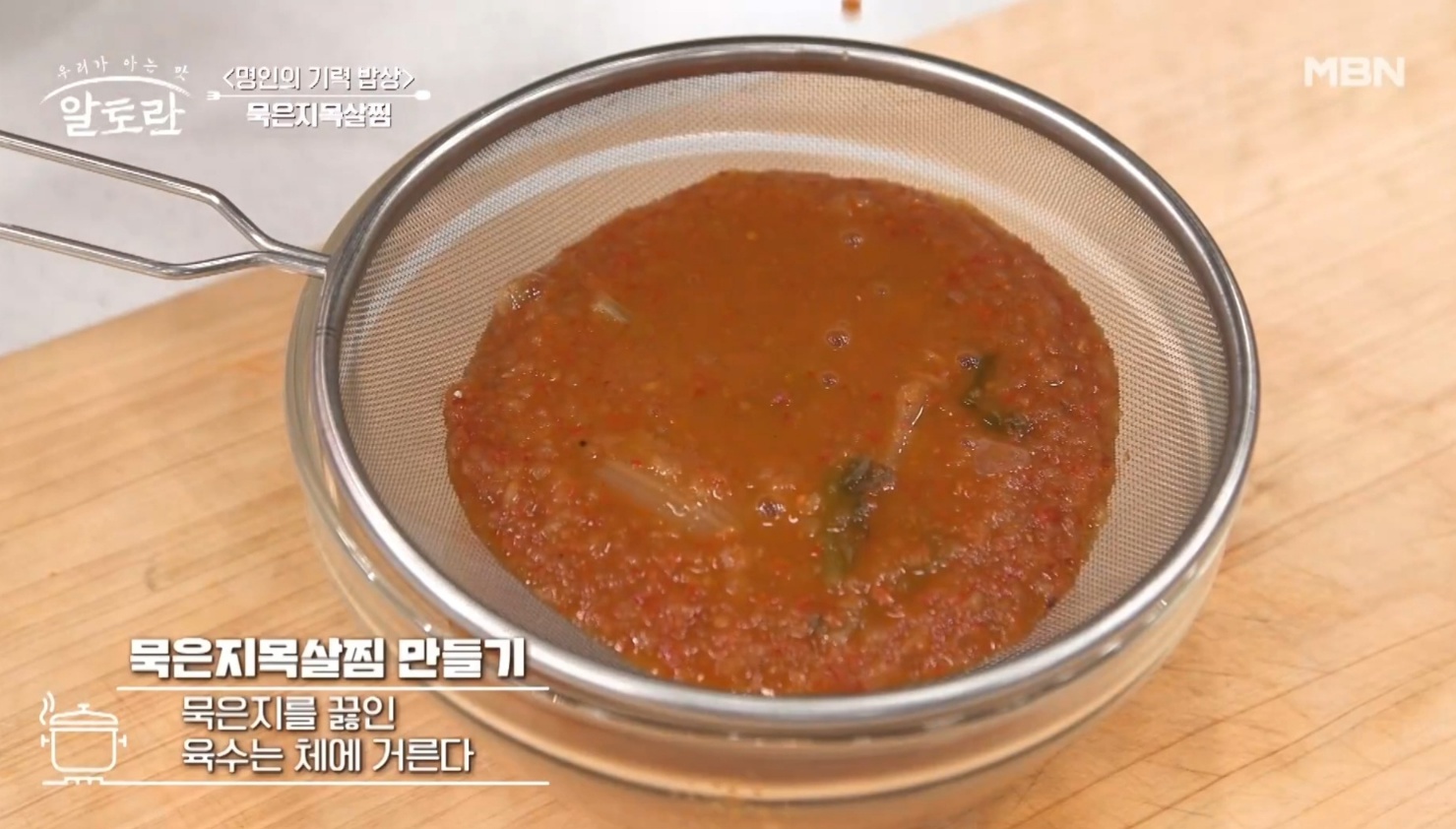 17. 묵은지를 끓였던 육수를 체에 한번 걸러 줍니다.