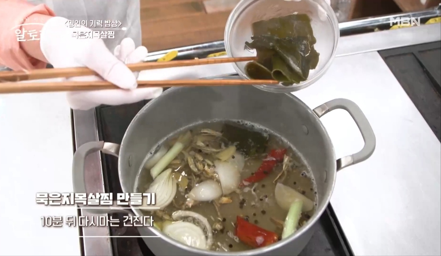 11. 10분간 끓인 뒤 다시마는 건져내 주세요.