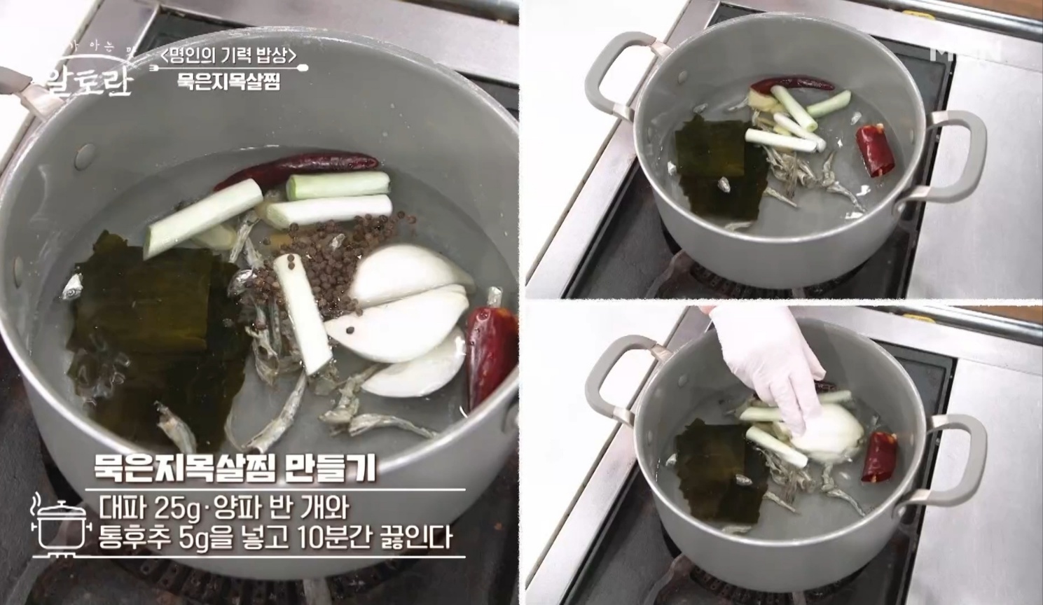 대파 25g, 양파 반 개, 통후추 50g을 넣고 10분간 끓여주세요.
