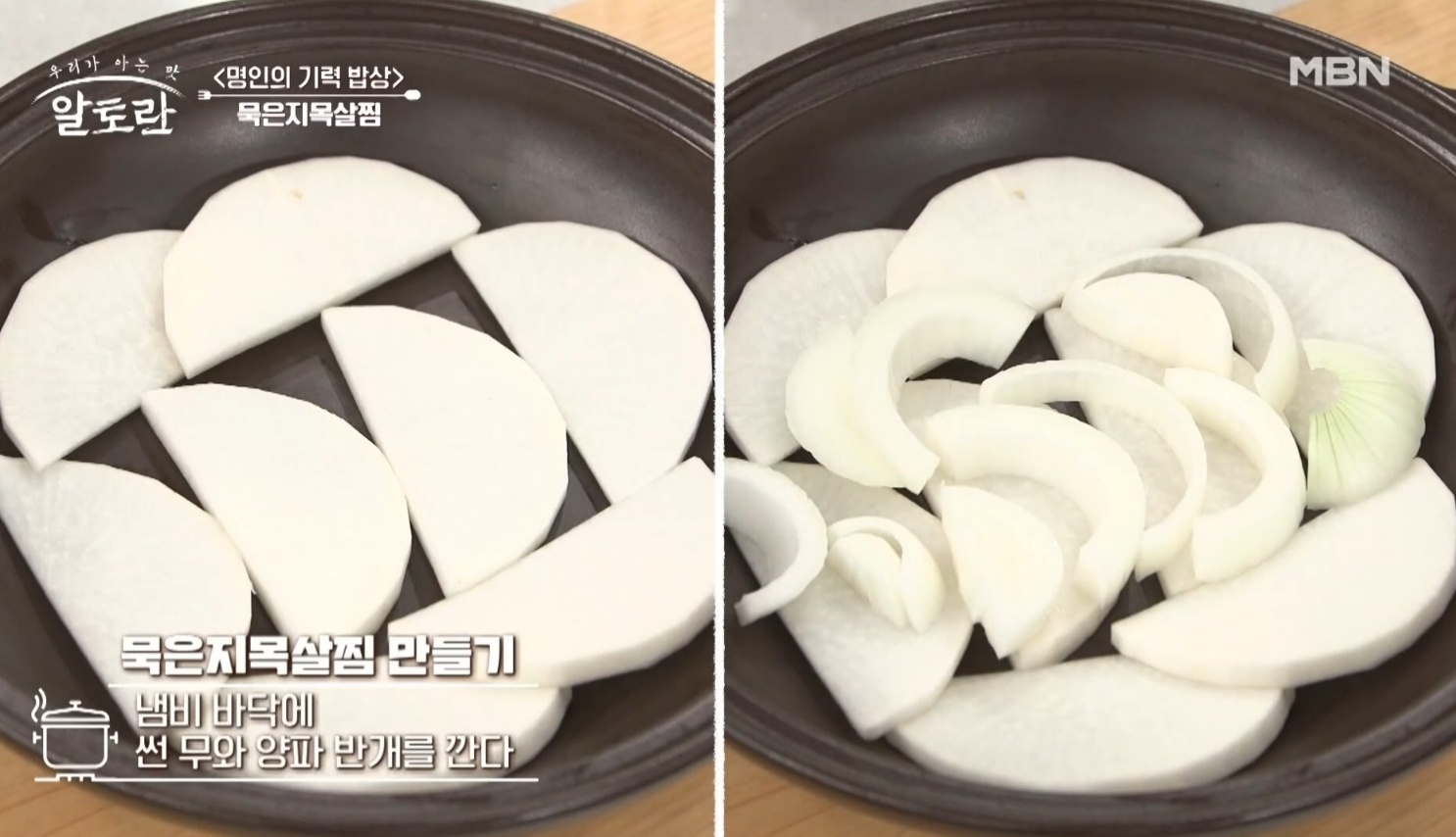 15. 무 200g과 양파 1개를 썰어준 뒤 냄비 바닥에 깔아줍니다.