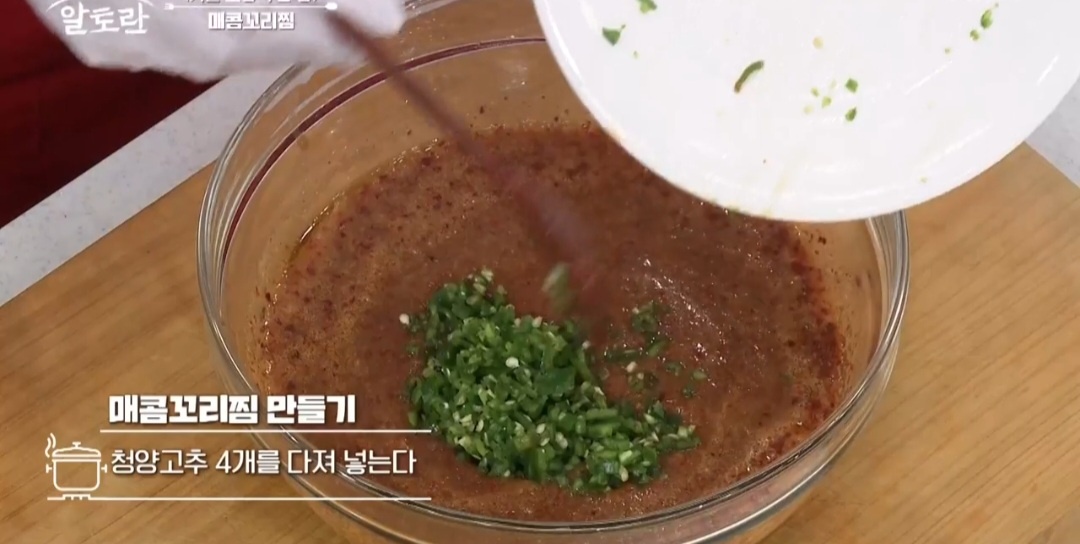 6. 청양고추 4개를 다져서 넣어주어 깔끔한 매운맛을 더해줍니다.