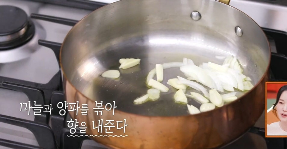 팬에 올리브유를 두르고 마늘과 양파를 중강불에서 볶아주며 향을 내줍니다.