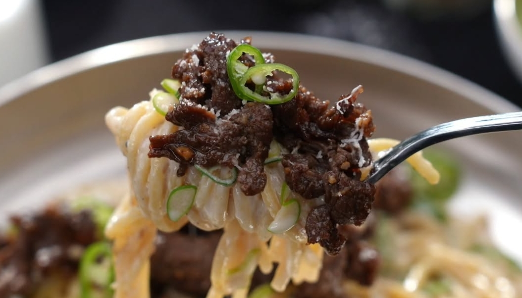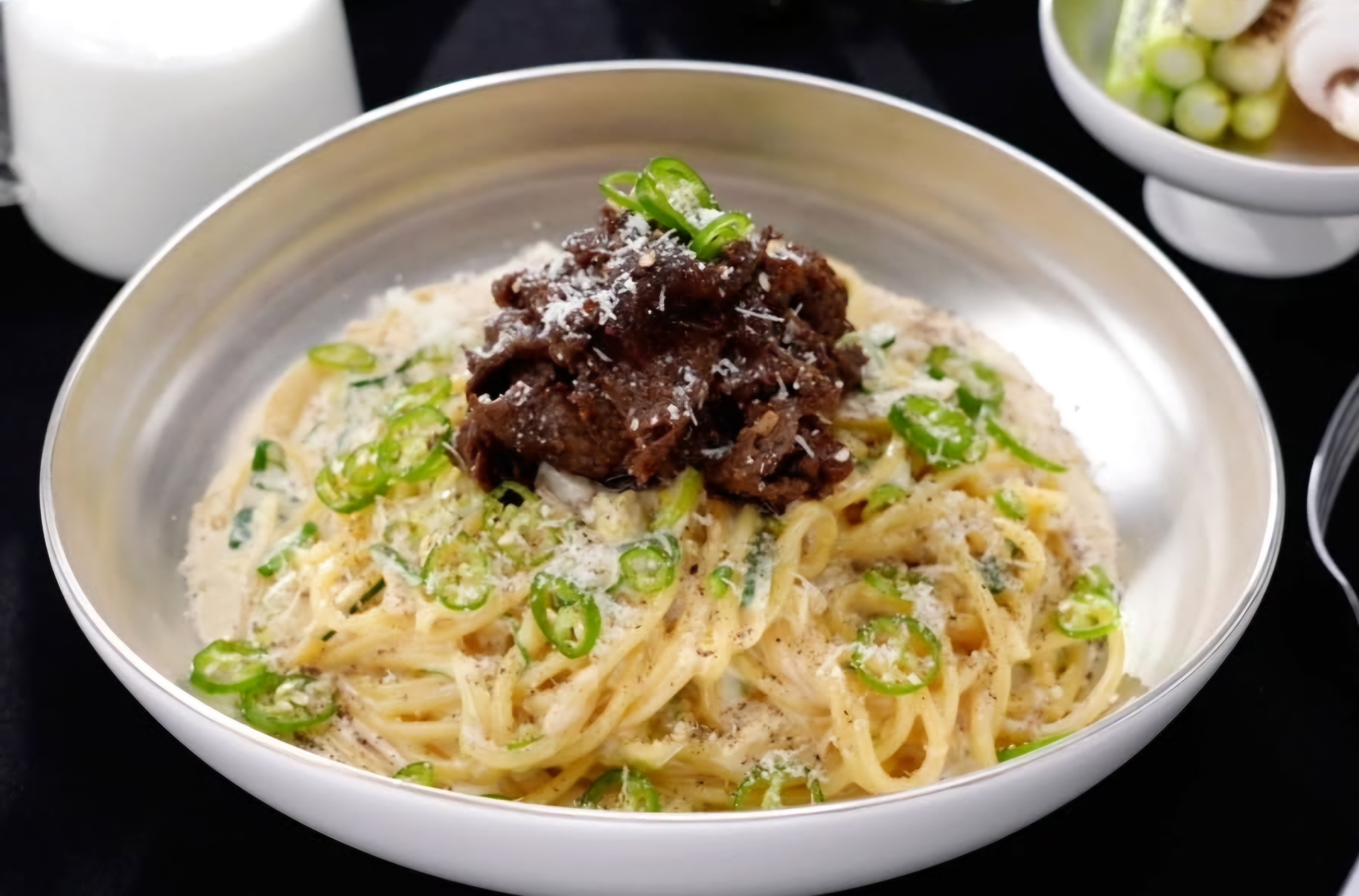 7. 대파크림파스타 위에 불고기를 올려주고, 파마산치즈 1큰술까지 갈아서 올려주면 이정현 대파크림파스타 완성입니다!