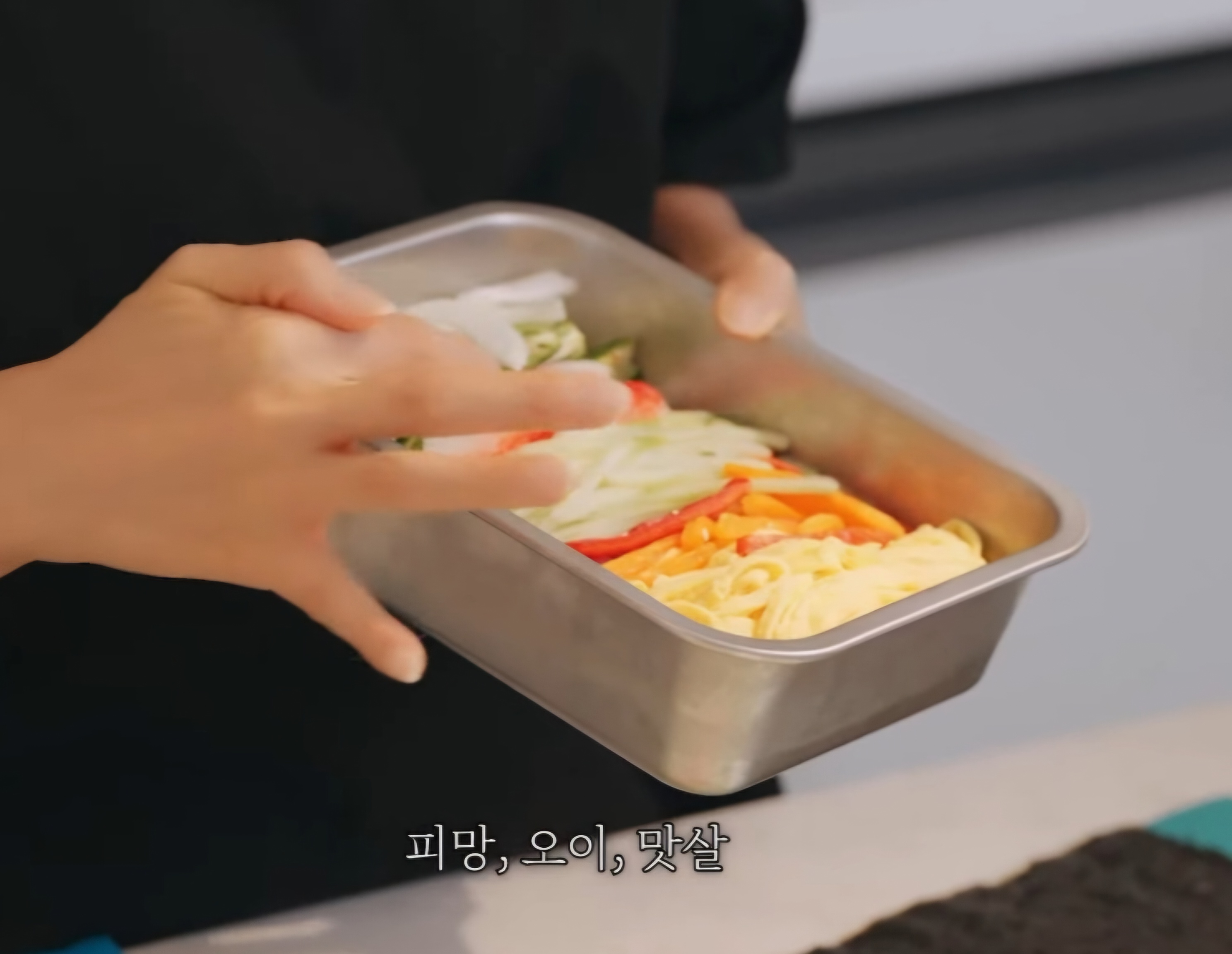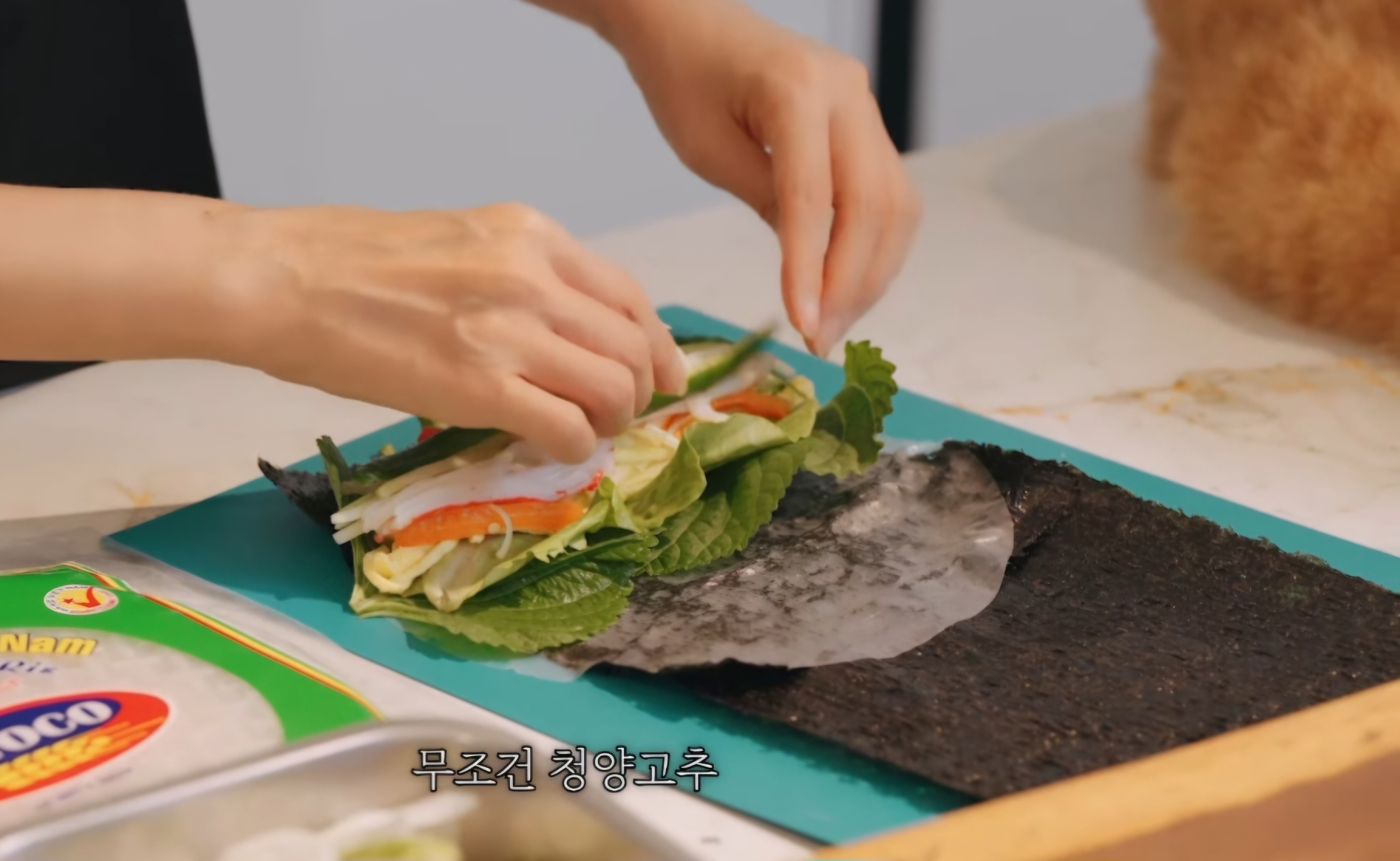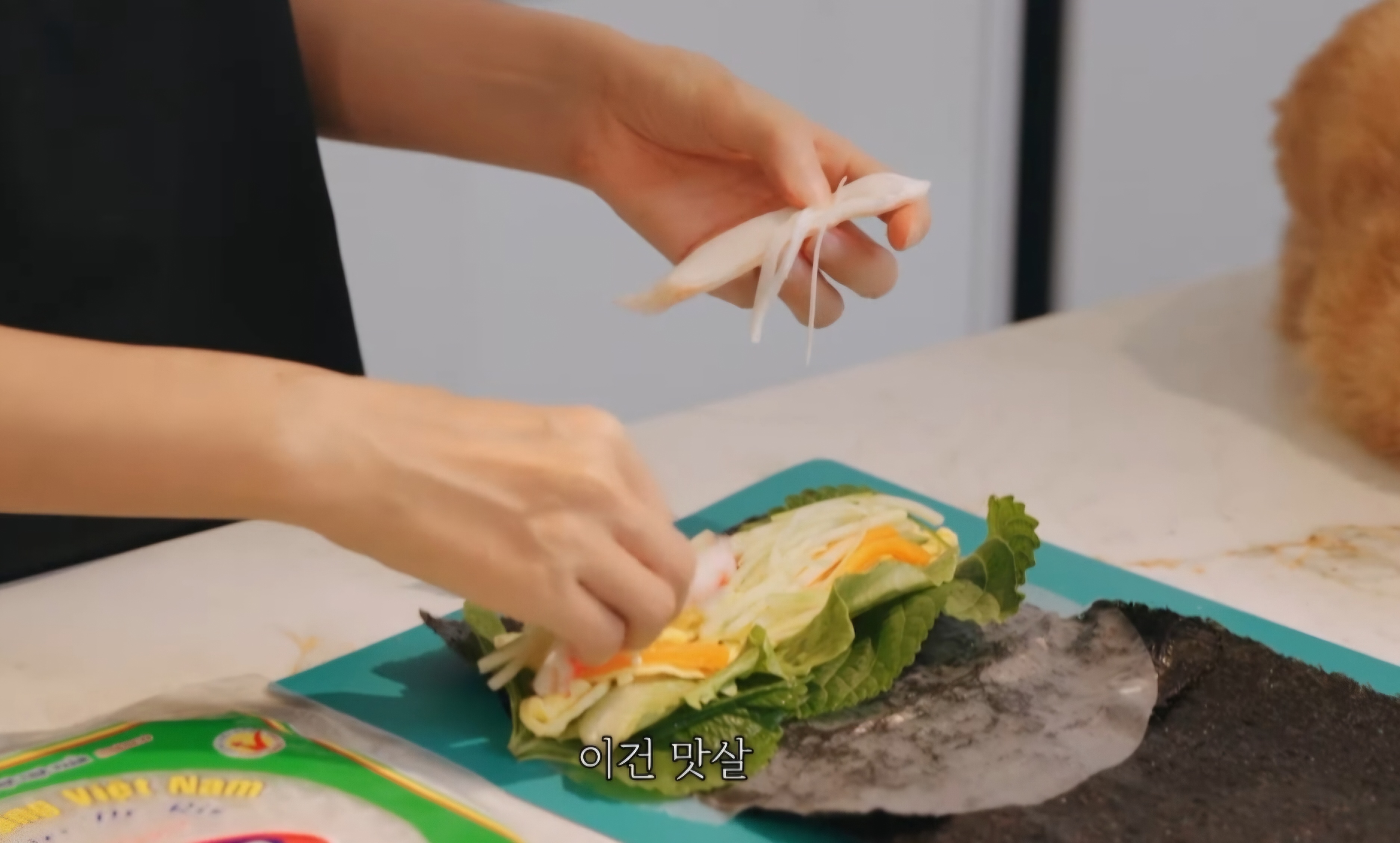 더욱 맛있게 먹기 위해 김완선은 맛살도 찢어서 올려주었습니다.