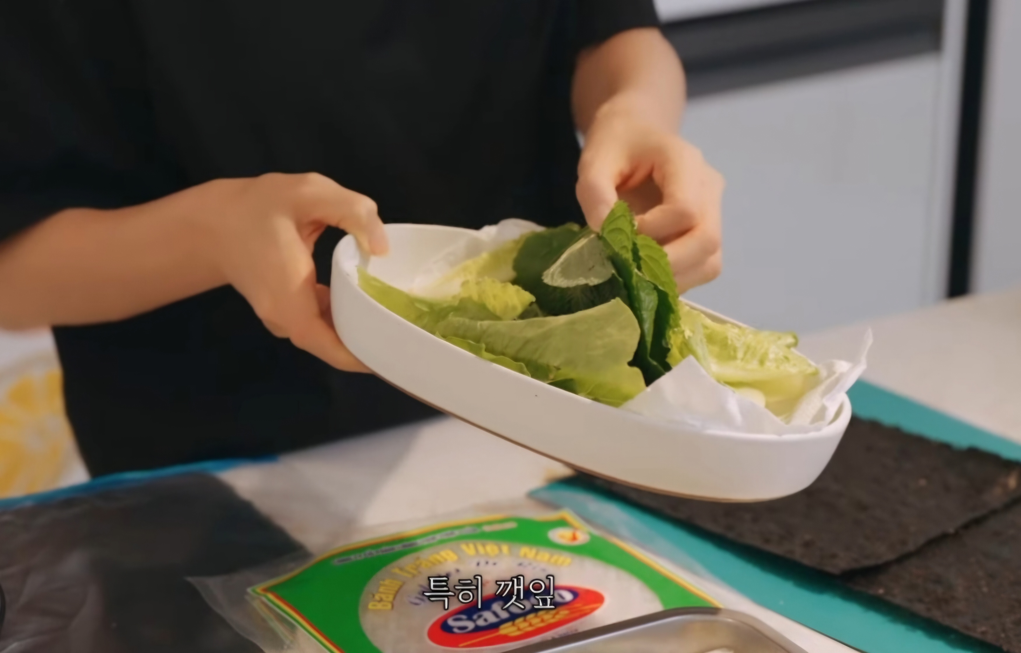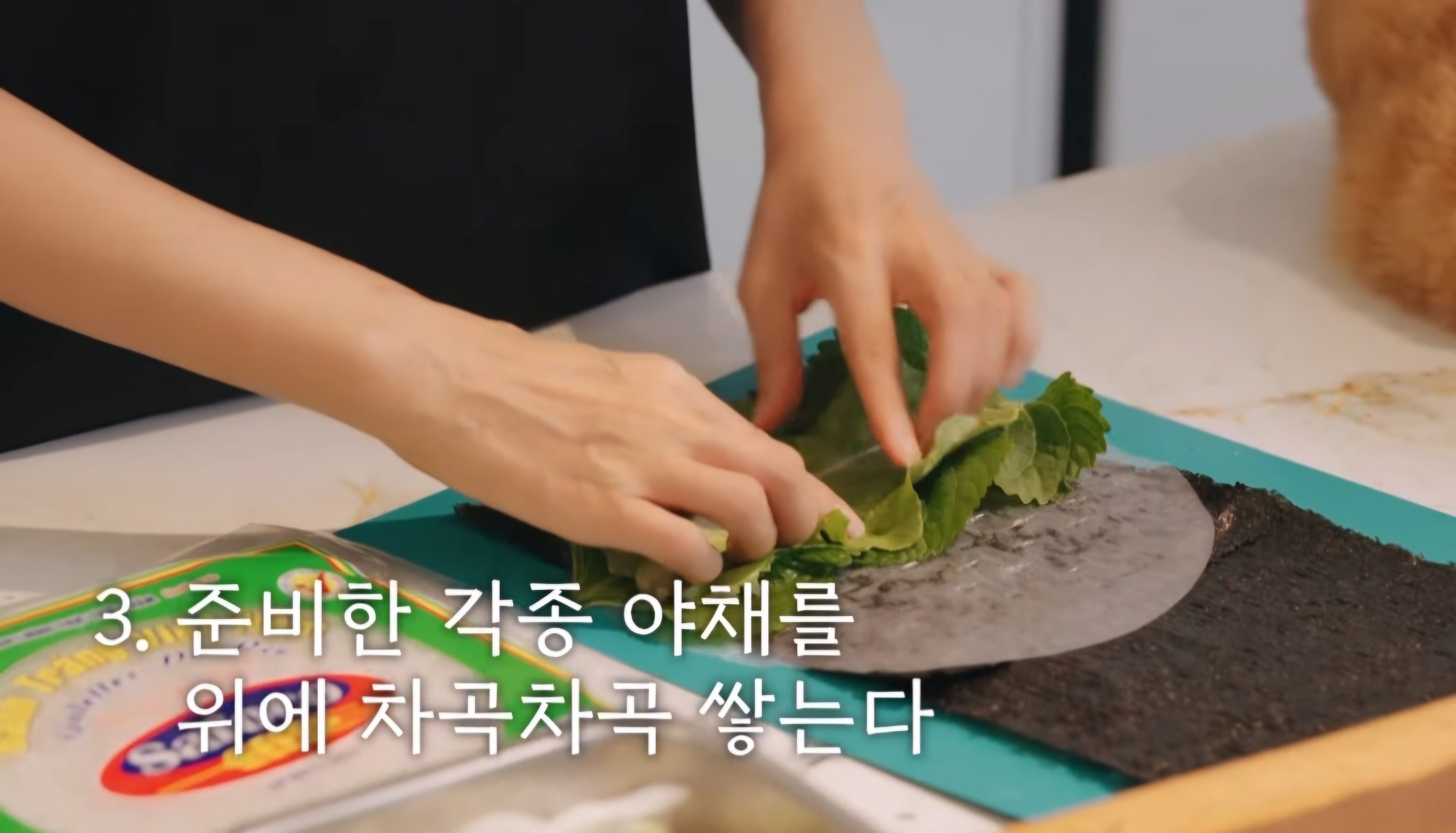 3. 라이스페이퍼 위에 깻잎을 올려주고, 다른 쌈채소들도 차곡차곡 쌓아줍니다.