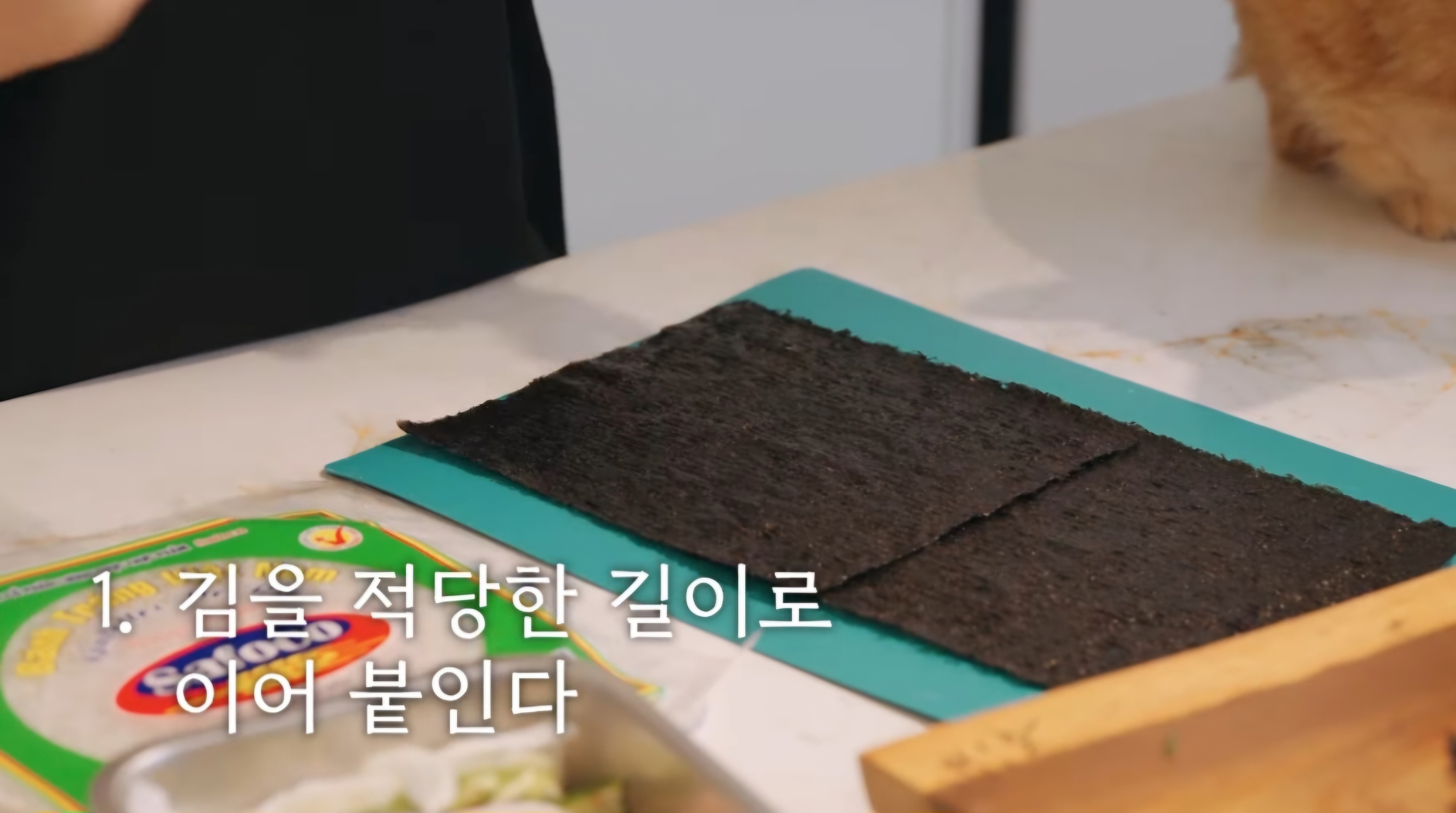 1. 먼저 김 2장을 적당한 길이로 이어 붙여주세요. 김밥을 만들 때 김은 거친면이 안쪽으로 오도록 하면 됩니다.
